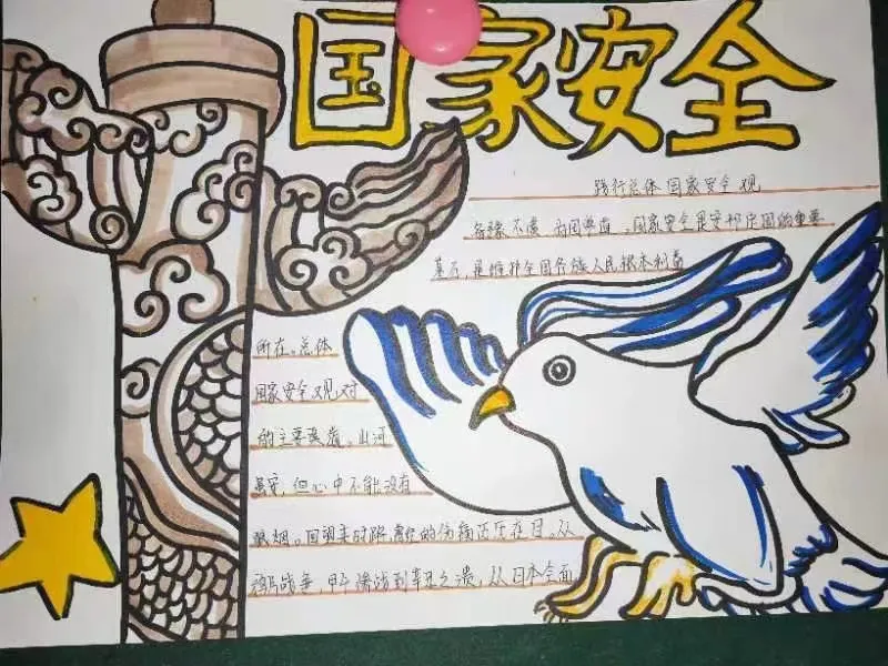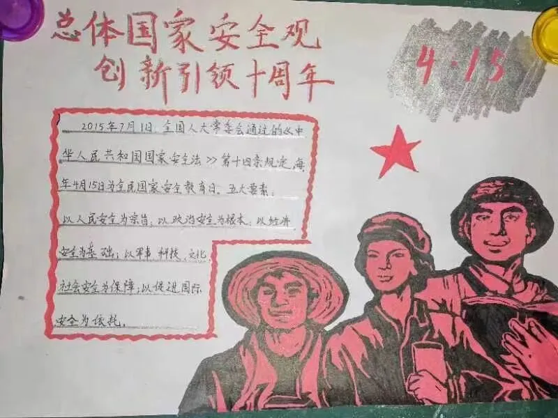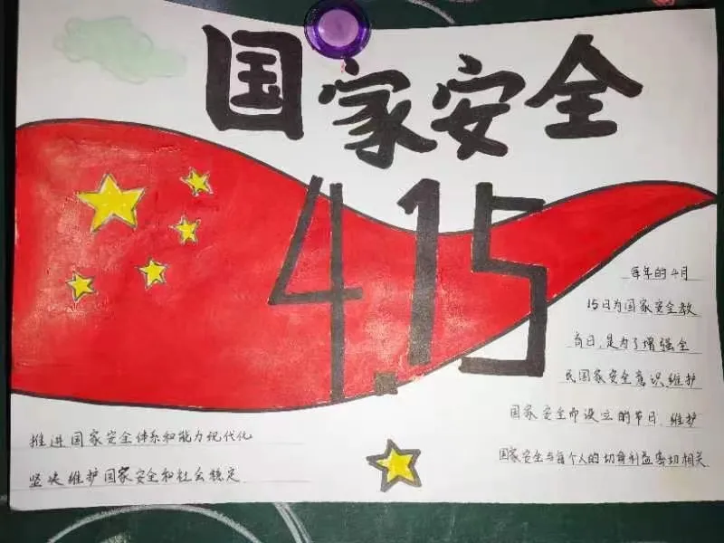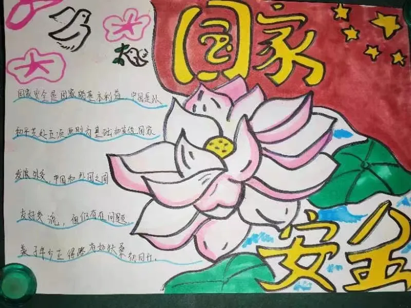此次安全教育主题墙展示活动向同学们征集全民国家安全教育手抄报并将优秀作品进行展示,要求书写工整、美观,图案精美、反映主题,图案、文字搭配比例适当,以“维护国家安全,共筑和谐校园”为主题,充分发挥学生想象力、创造力和动手能力。持续加强学生的国家安全教育,进一步完善和拓展国家安全教育的方式,让国家安全知识深入人心、落地生根,引导广大学生树牢总体国家安全观,共筑国家安全防线。