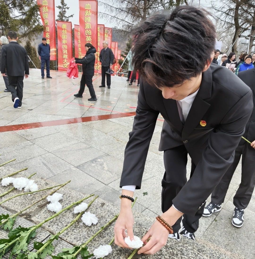 默哀仪式后,团员代表缓步走向纪念碑,郑重向革命烈士纪念碑敬献花篮。花篮承载着敬仰,花朵寄托着哀思,昭示着新时代青年在红色基因的指引下赓续精神薪火、勇担时代使命的坚定信念。