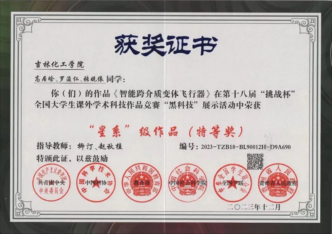 2023年全国第十八届“挑战杯”黑科技专项国家级特等奖(项目负责人);2024年公布发明专利一篇(学生一作);2025年发表SCI论文一篇;2022年获全国大学生数学竞赛初赛国家三等奖;2022年获全国大学生数学建模省二等奖(负责人);2022-2023年度国家励志奖学金;2023年吉林省高校大学生机器人大赛省三等奖;2023-2024年度负责创新创业省级立项项目《智能跨介质无人机》;连续三学年获校级优秀学生;连续七学期获校级奖学金。