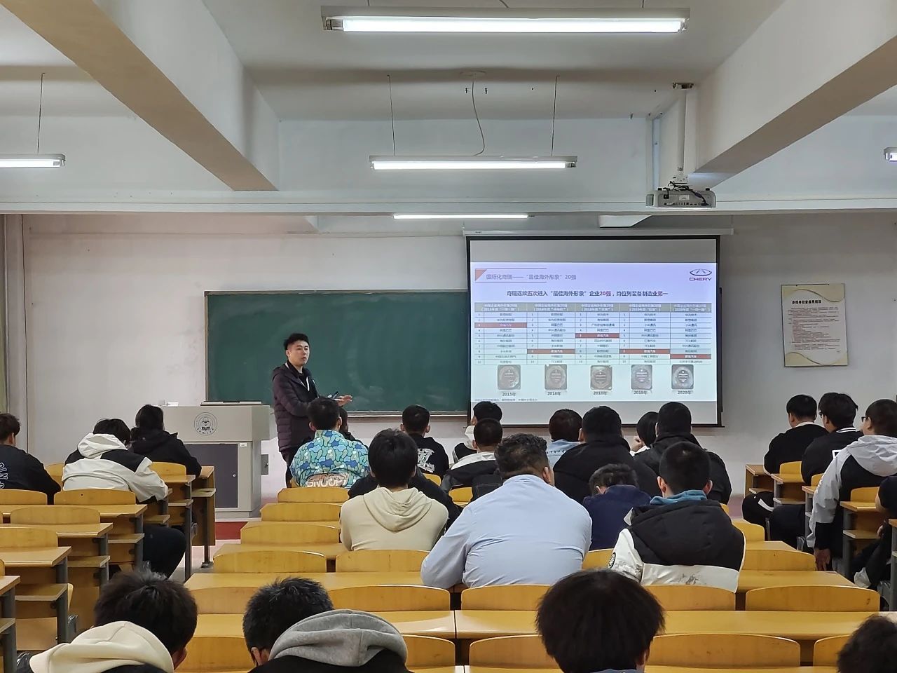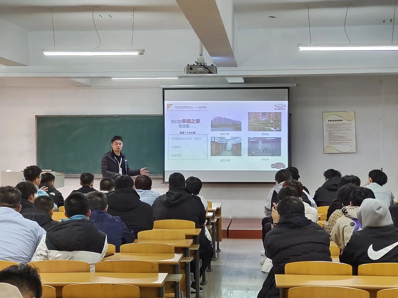 会议伊始,奇瑞汽车公司的负责人分别向同学们介绍了企业基本情况以及公司发展规划,诚挚邀请相关专业的同学加入,希望同学们能在企业里获得施展才华的机会和舞台。